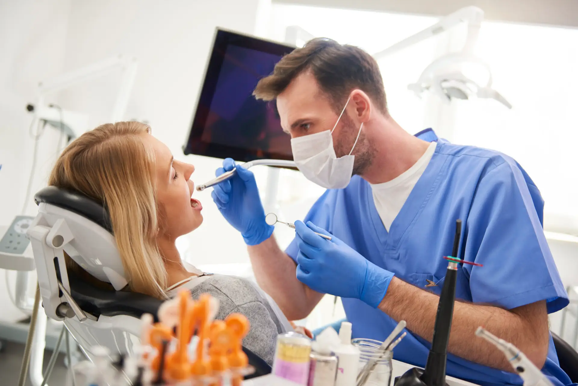 Focused dentist using dental drill and dental mirror